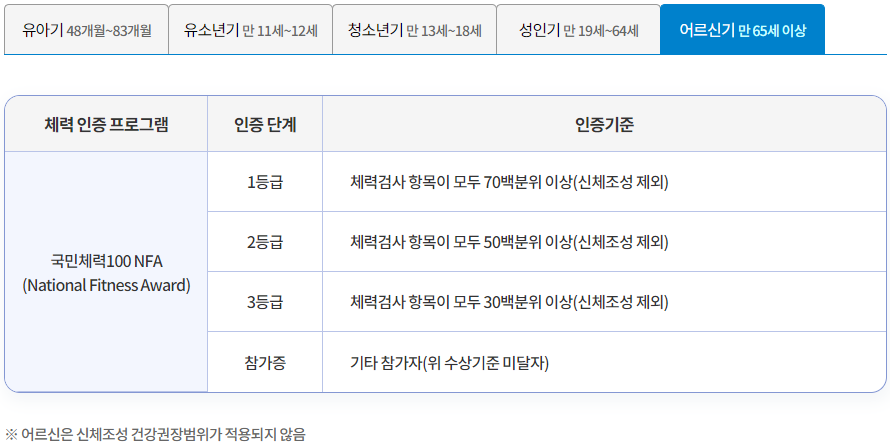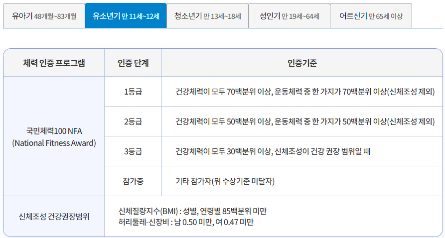 체력 측정을 받고 나면, 성별과 연령별에 따른 백분위와 체력 인증 단계 결과가 나옵니다. 이 결과는 1~3등급으로 나누어져 있습니다.