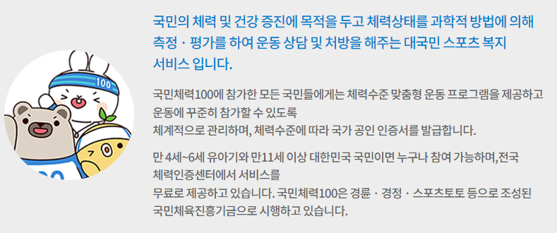국민체력 100은 국민의 체력과 건강 증진을 위해 국가에서 제공하는 체력관리 서비스입니다. 체력 측정, 맞춤형 운동 처방, 체력 증진교실 등 다양한 프로그램을 제공하고, 스포츠 상품권으로 전환할 수 있는 튼튼 머니도 지급됩니다.