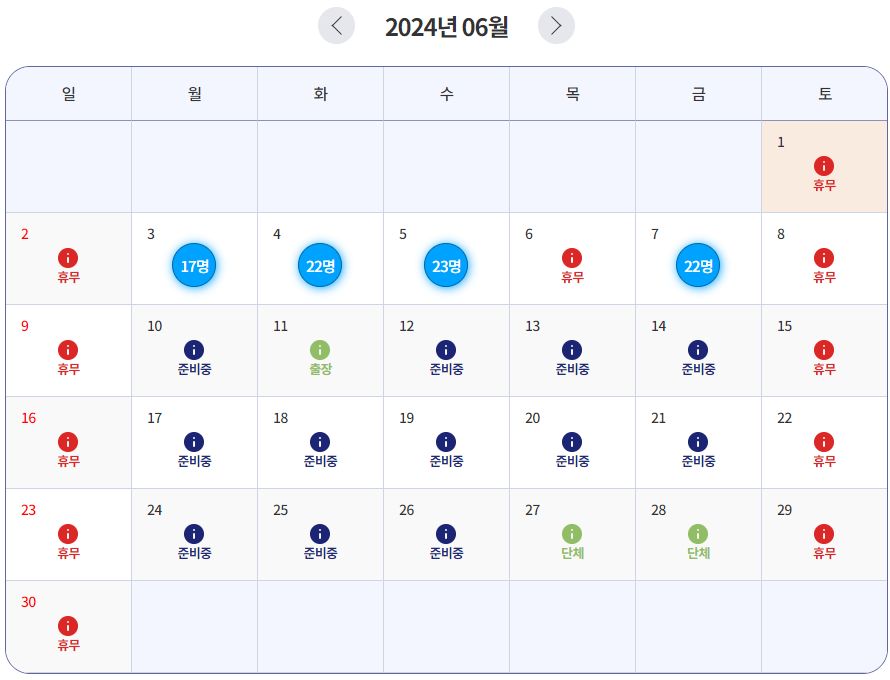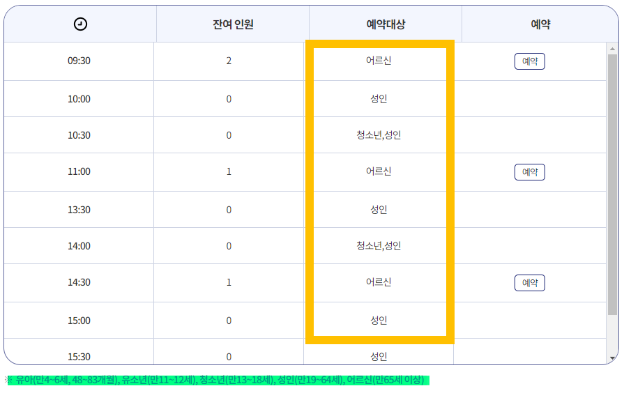 원하는 지역을 선택하시면 아래에 날짜마다 예약가능한 인원과 가능한 시간이 뜹니다.
