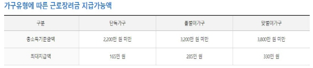 - 배우자 또는 부양자녀 또는 70세 이상 직계존속이 있는 가구 (배우자가 있는 경우에는 신청인 또는 배우자의 총 급여액 등이 300만 원 미만이어야 함)