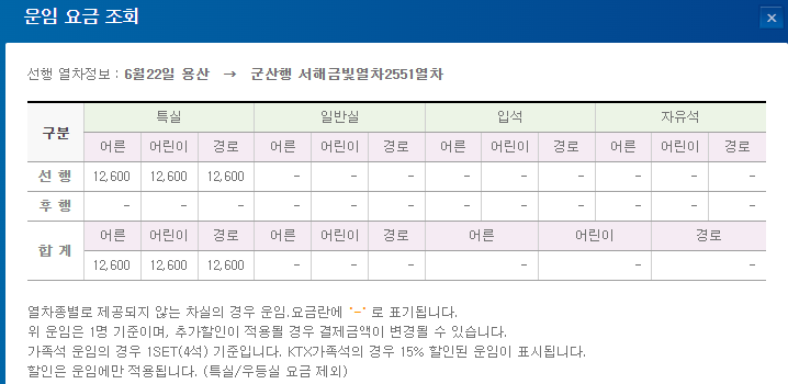 - 용산 - 군산 : ₩12,600원 (어른, 어린이, 경로 모두 동일)