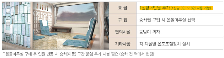 - 일반 좌석 요금에 객실 당 ₩40,000원의 추가 요금 발생