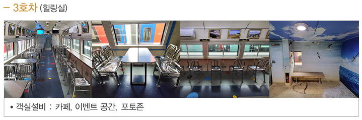 3호차는 힐링실이라 하여 차와 커피를 즐길 수 있도록 카페로 꾸며져 있습니다. 또 가족끼리 즐길 수 있도록 오락 시설도 마련되어 있습니다. 서해안의 역사와 문화를 소개하는 전시 공간이 있어 정보를 얻을 수 있는 전시도 되어 있습니다.