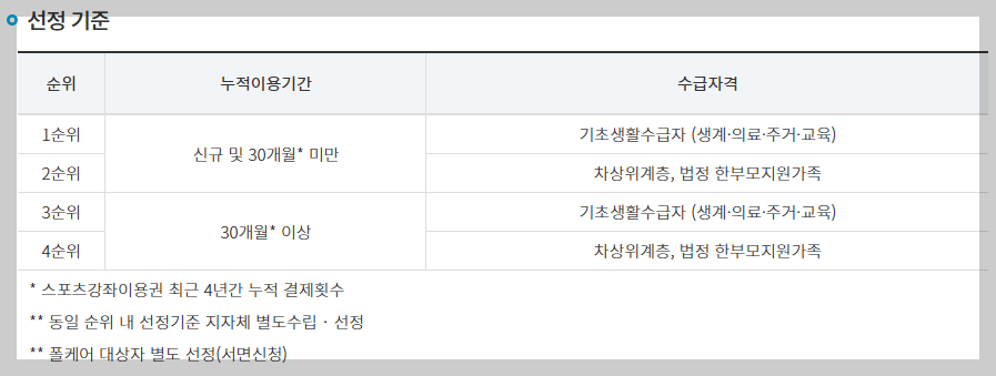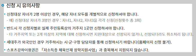 - 지원 내용 : 1인당 매월 11만 원 이내 스포츠강좌 수강료 지원