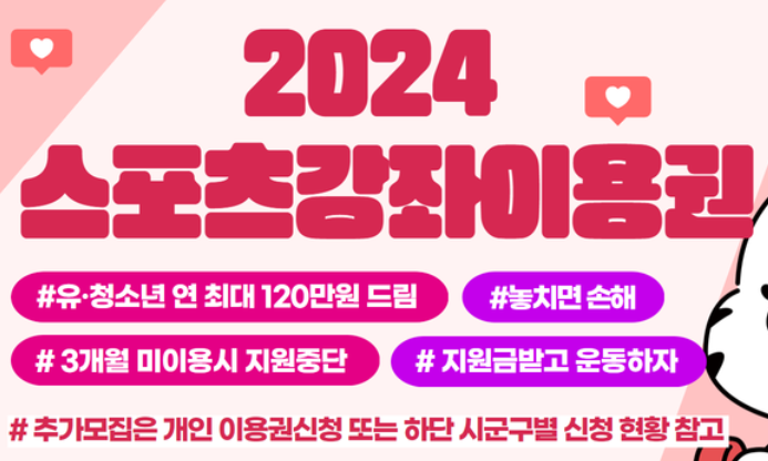 스포츠강좌이용권은 저소득층 유 · 청소년과 장애인들이 스포츠 활동에 참여할 수 있도록 돕는 지원 제도입니다. 건강한 신체와 활기찬 삶을 위해 스포츠강좌이용권을 적극적으로 활용해 보세요. 몸이 건강해지면 마음도 정신도 건강해질 수 있습니다. 건강한 하루하루가 되길 기원합니다!