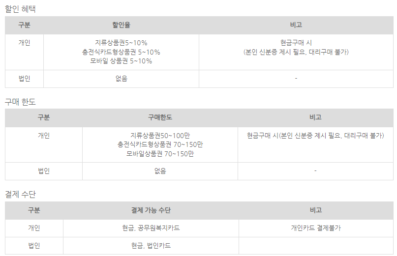 - 구매 방법 : 종이 상품권과 마찬가지로 은행 및 온라인을 통해 구매할 수 있습니다.