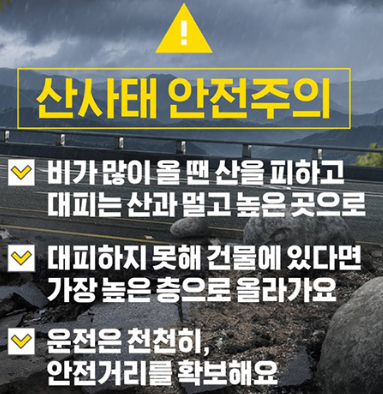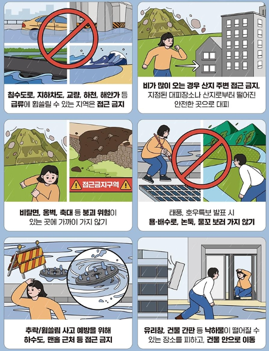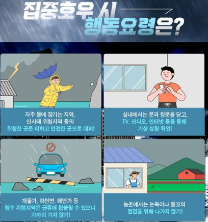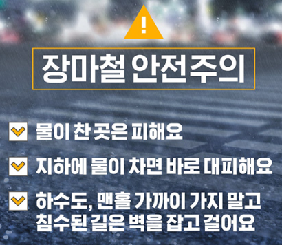 장마철에는 날씨 정보를 미리 확인하고 대비하는 것이 매우 중요합니다. 비가 오는 날에는 가급적 야외 활동을 하지 마시고, 안전한 곳에서 머무는 것이 좋습니다. 작년 갑작스러운 비로 인해 많은 분들이 사고를 당했습니다. 올해는 안전한 여름이 되길 기원합니다.