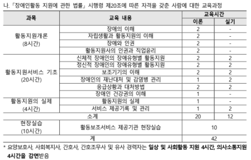 만약 요양보호사, 사회복지사, 간호사와 같이 유사 경략자들은 교육 과정 중 활동지원의 실제 과목의 8시간을 감면받을 수 있습니다.