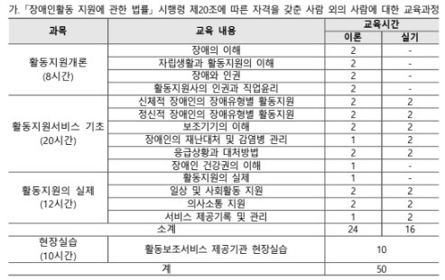 장애인 활동지원사가 되려면 활동하고자 하는 지역 교육기관에서 교육을 이수하여야 합니다. 이론 및 실기교육 40시간, 현장실습 10시간으로 총 50시간의 교육을 받습니다.