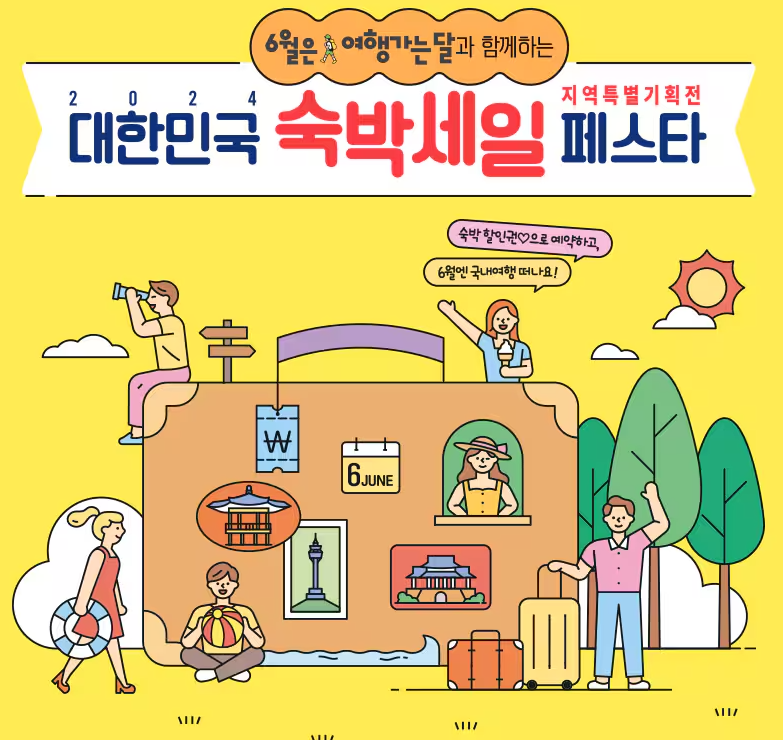 6월은 여행 가는 달로 지정되어 다양한 혜택과 특별한 여행 프로그램을 즐기며, 국내 여행을 통해 지역 경제에 활력을 불어넣기 위한 캠페인입니다. 교통, 숙박, 그리고 놀거리 등을 최대 50% 할인받아 여행을 가볼까요?