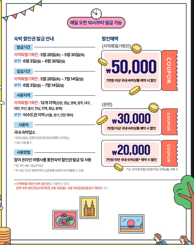 등록된 국내 숙박 시설 이용 시, 온라인으로 7만 원 이상 숙소를 예약하면 최대 5만 원 할인 쿠폰을 받을 수 있습니다.