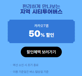 카카오 T를 통해 지역 시티투어버스를 예매하고 50% 할인받아 여행하세요! 사용 기간은 6월 1일 ~ 6월 30일, 판매 기간은 5월 20일 ~ 6월 29일입니다. 이용 기준일은 버스 탑승일 기준입니다. 예약 마감 되기 전, 미리 일정 잡으셔서 즐거운 여행 하세요!