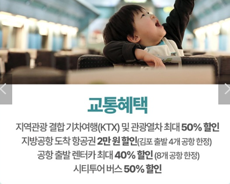 여행을 가려면 먼저 교통편이 준비되어야겠죠? 비행기, 철도, 카셰어링을 할인받을 수 있습니다. 또한 여행을 간 지역의 시티투어를 최대 50% 할인받을 수 있습니다. 예산 소진 시 조기 종료 될 수 있으니 서두르세요!
