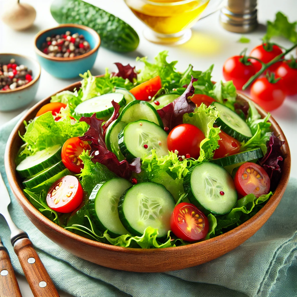 오이와 토마토, 양파를 얇게 썰어주어 그릇에 담고, 올리브 오일, 레몬즙, 소금, 후추로 드레싱을 만들어 줍니다. 드레싱을 뿌려 섞어주세요.
