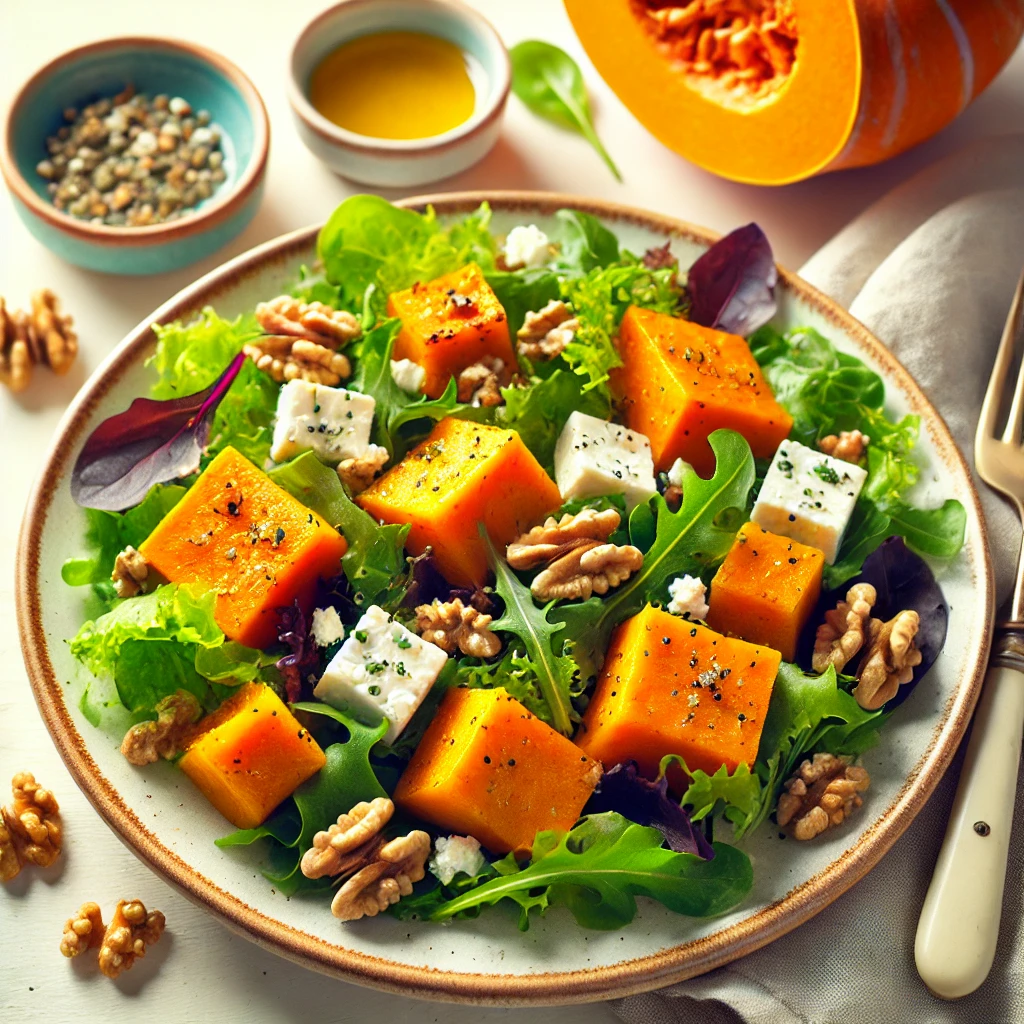 단호박을 먹기 좋은 크기로 자르고, 올리브 오일, 소금, 후추로 간을 맞춰 오븐에서 200도로 20분간 굽습니다. 구운 단호박을 샐러드 채소와 견과류와 함께 섞어줍니다.