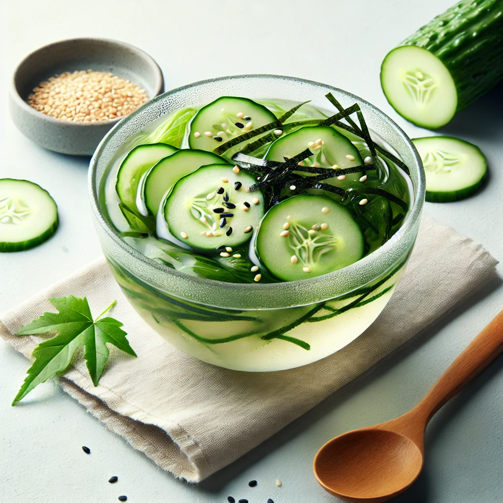 오이를 얇게 썰어 소금에 절인 후 물에 씻어줍니다. 물에 식초, 설탕, 다진 마늘을 넣고 오이를 섞어 냉장고에 넣어 차게 해 줍니다. 더 시원하게 드시고 싶으면 기호에 따라 얼음을 넣어주셔도 좋습니다. 먹기 전 깨를 뿌려줍니다.